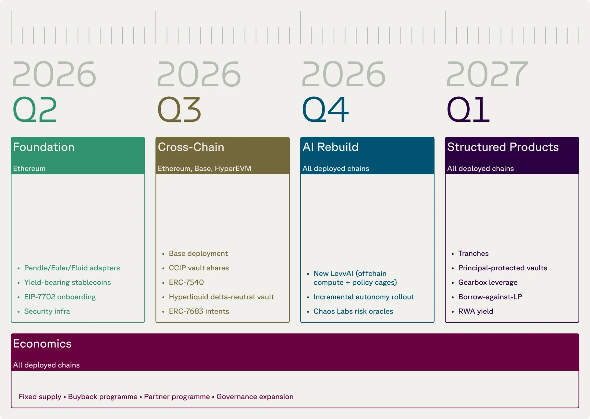 Q4 2026. Scale buyback programme with cross-chain fee aggregation. Introduce governance votes on LevvAI risk parameters and allocation boundaries per vault tier.
